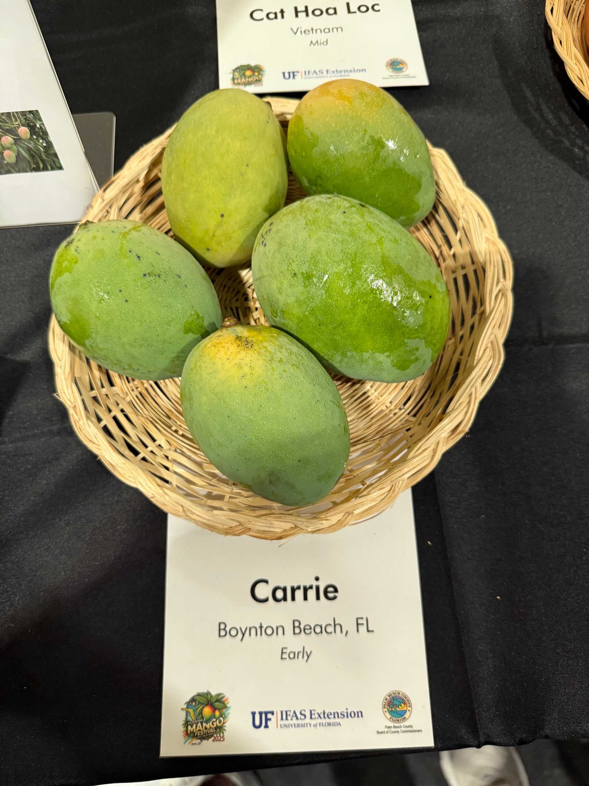 The fruit are small-to-medium, oval-shaped, and yellow at maturity, although inland-grown fruit may remain partially green when ripe. Flesh is orange, fiberless, and contains a monoembryonic seed. Carrie is known for its strong, distinctive flavor, with a pronounced spice component that appeals to many people from India and the West Indies. Fruit are early season, generally ripening from May through July, and should be allowed to soften on the tree for optimal flavor. Once ripe, they have a very short window for consumption due to extreme softness and susceptibility to bruising.