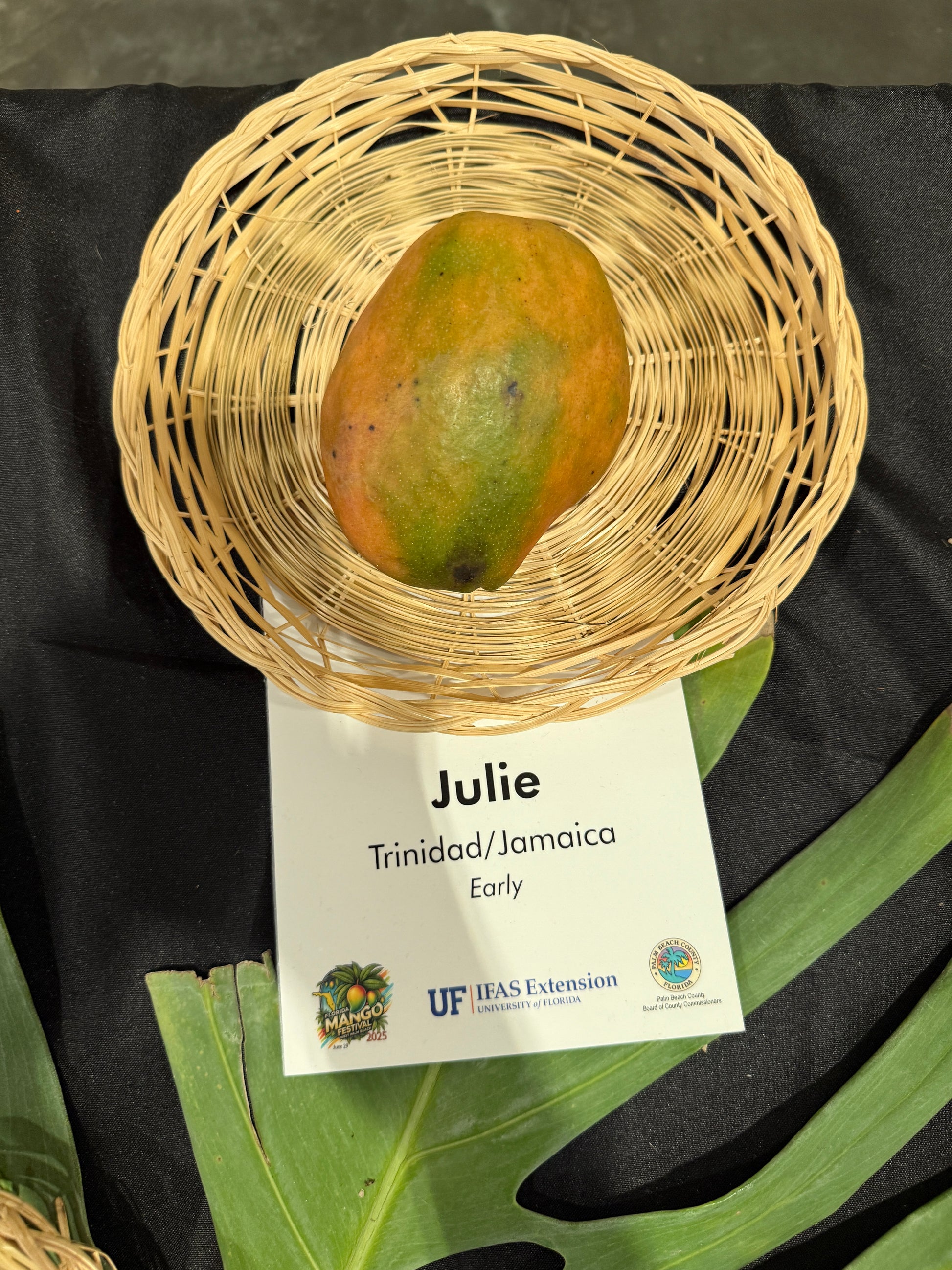 Julie is a West Indies mango, with origins debated between Trinidad and Jamaica, sometimes called “Saint Julien.” Introduced to Florida in 1907 (USDA PI 21515), it has contributed to the ancestry of many Florida varieties, including Sophie Frey, Ice Cream, Graham, Super Julie, Juliette, and Little Gem.