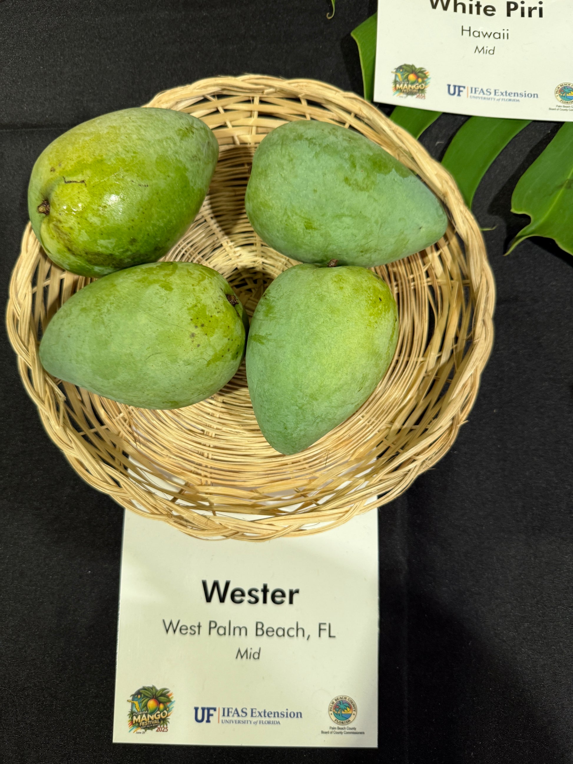 This mango is an Edward seedling selected by David Sturrock from his breeding work begun in the 1950s in West Palm Beach, Florida. It was originally designated Edward × Earle #15, a name it still carries in the USDA collection at TREC in Homestead. The cultivar was later named in honor of P.J. Wester, a former head of the USDA Plant Introduction facility in Miami. The pollen parent was Earle, a Philippine-Carabao–type mango. The original tree remains standing at the Sturrock farm.